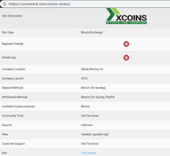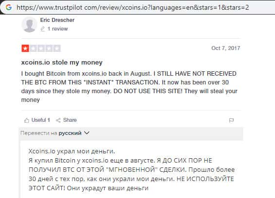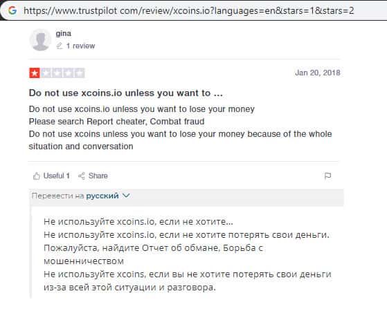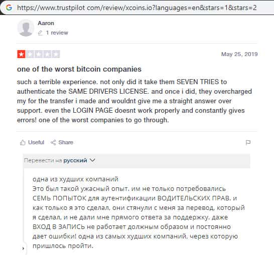 - Самая низкая оценка из возможных у крипто-брокера xCoins на веб-ресурсе sitejabber com