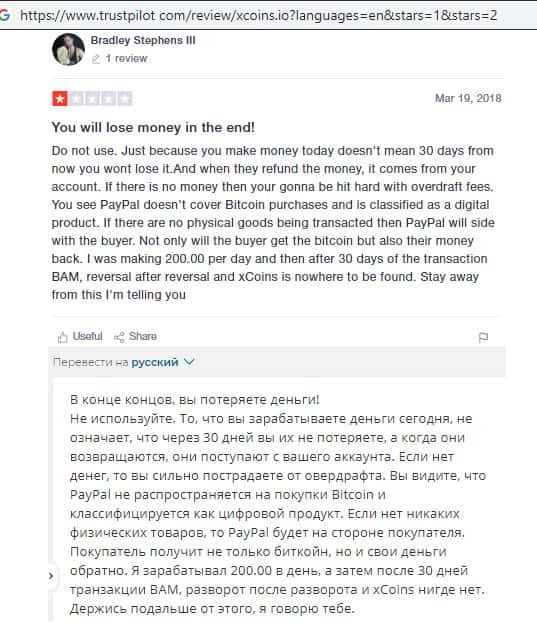 Автор данного отзыва отмечает, что идея самой платформы в принципе хороша, но ее воплощение в жизнь ужасное: жульё Икс Коинс не следит за тем, что происходит у них на платформе, и кто на ней торгует, из-за чего процент мошенничества очень высок. В таких условиях клиенты просто не могут остаться довольными и с прибылью.