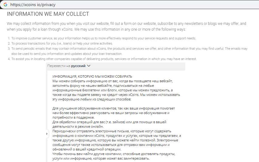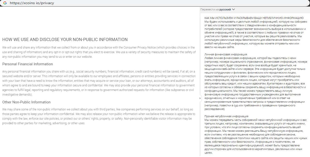 Информацию, которую о вас собирают, хранят на сервере и могут передавать сотрудникам, а также третьим лицам, которые осуществляют свою деятельность в партнёрстве с мошенниками Икс Коинс. В целом политика конфиденциальности является сомнительной, так как она не гарантирует безопасность ваших данных, так что не связывайтесь с жульём.