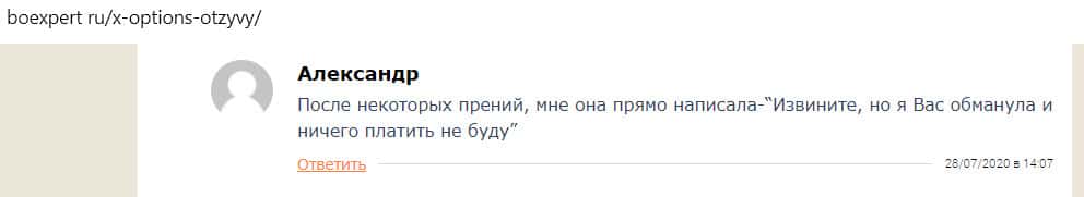 Александр описал вопиющую ситуацию, как мошенница из конторы Х-Оptions прямо сказала ему, что обманула и теперь ничего платить не будет.