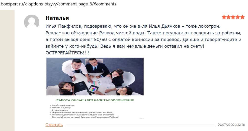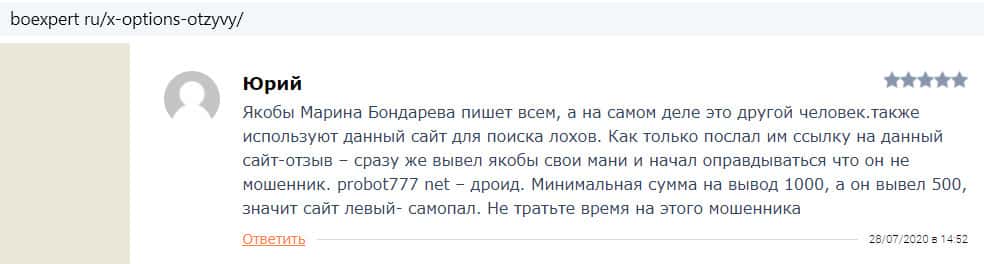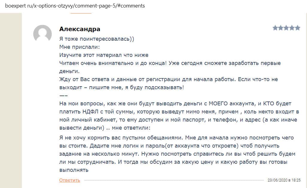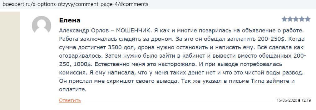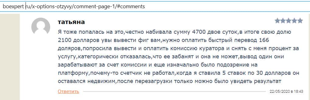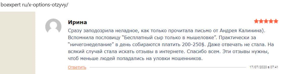 Ирина написала отзыв, что догадалась о том, что на сайте Х-Оptions действуют мошенники. Никто не будет просто так платить людям по 200 долларов в день, как они обещают.