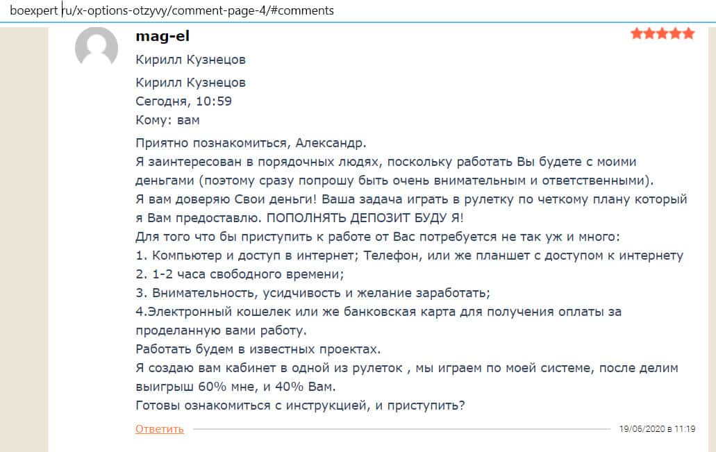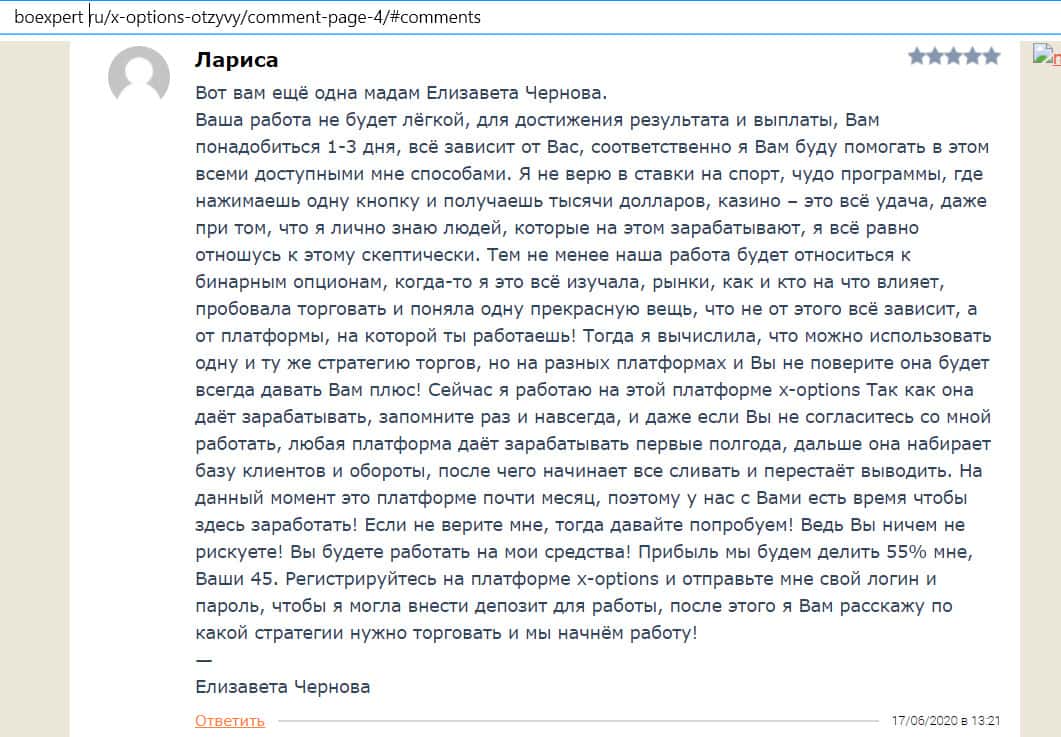 Лариса описала в своем отзыв не сайте Боэксперт, как разводят людей на деньги аферисты из Икс Опционс. К отзыву прилагается скрин переписки с мошенницей.
