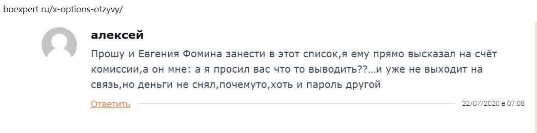 Алексей оставил отзыв о том, что менеджер Х-Оptions Евгений Фомин не стал выводить деньги клиента по его просьбе. После этого сотрудник перестал выходить на связь.
