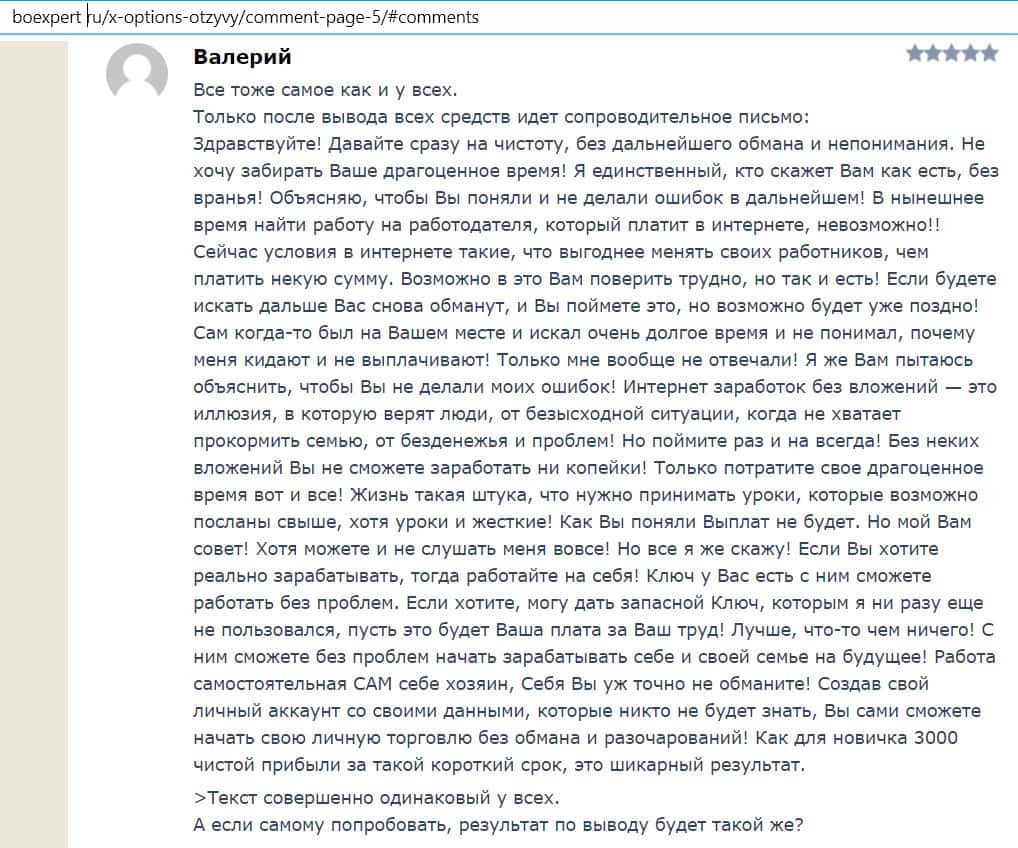 Валентина написала в своем отзыве, что также, как и другие, не смогла вывести свои средства с лоховской площадки Х-Оptions. Она советует людям не тратить зря время.