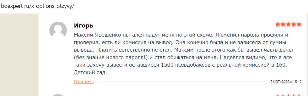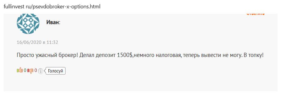 Иван написал в отзыве на сайте Фулинвест, что не может вывести 1500 долларов с площадки Икс Опционс. Не брокер, а просто ужас, нельзя с ним связываться!