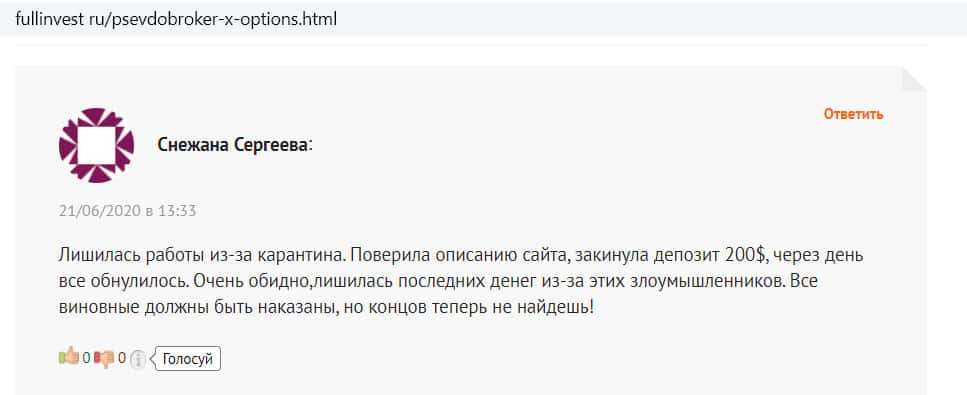Снежана пишет, что попала в трудную ситуацию из-за аферистов, создавших лохотрон Икс Опционс. Она вложила 200 долларов на счет, а на следующий день он исчезли.