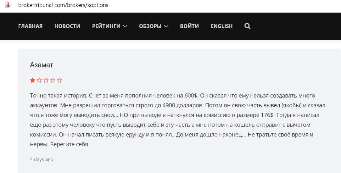 Азамат описал случай, как с ним поступили жулики Х-Оptions. Он вложил деньги в их проект, но, когда дошло до выплат, ему предложили заплатить 176 долларов за вывод.
