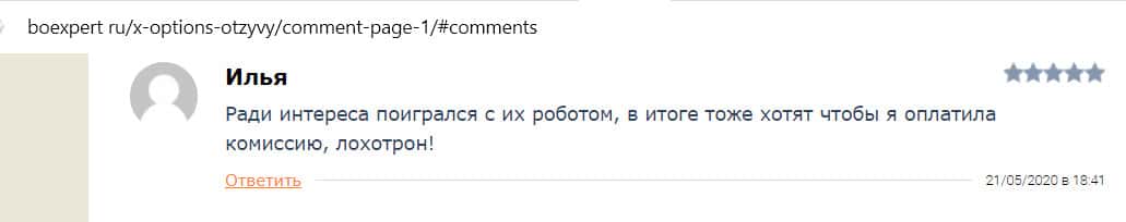 Сайт Фулинвест пишет, что Икс Опционс - очередной лохотрон. Трейдер ведет торговлю не на самом деле, ему только позволяют так думать, после чего просят заплатить комиссии.