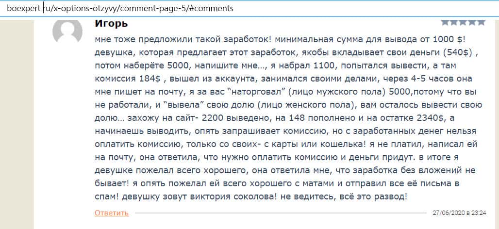 Олеся написала отзыв, что ее тоже развели в конторе Х-Оptions. Уговорили вложить деньги, а когда девушка хотела вывести их, стали заставлять пополнить еще.