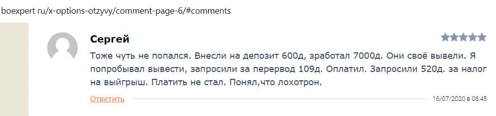 Сергей описал, как его чуть не развели на сайте Икс Опционс. Когда дошло до вывода денег запросили комиссию 109 долларов, а потом еще 520 дополнительно, якобы налог.