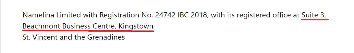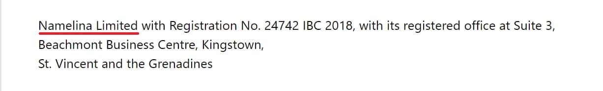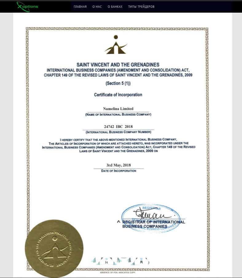 Юридическим лицом брокерской компании Икс Опционс является контора под названием Namelina Limited, зарегистрированная в офшоре Сент-Винсент и Гренадины.