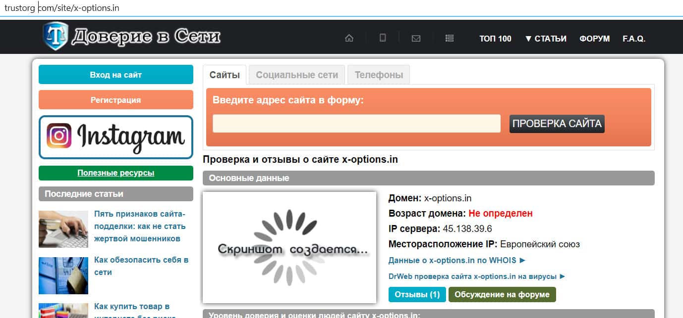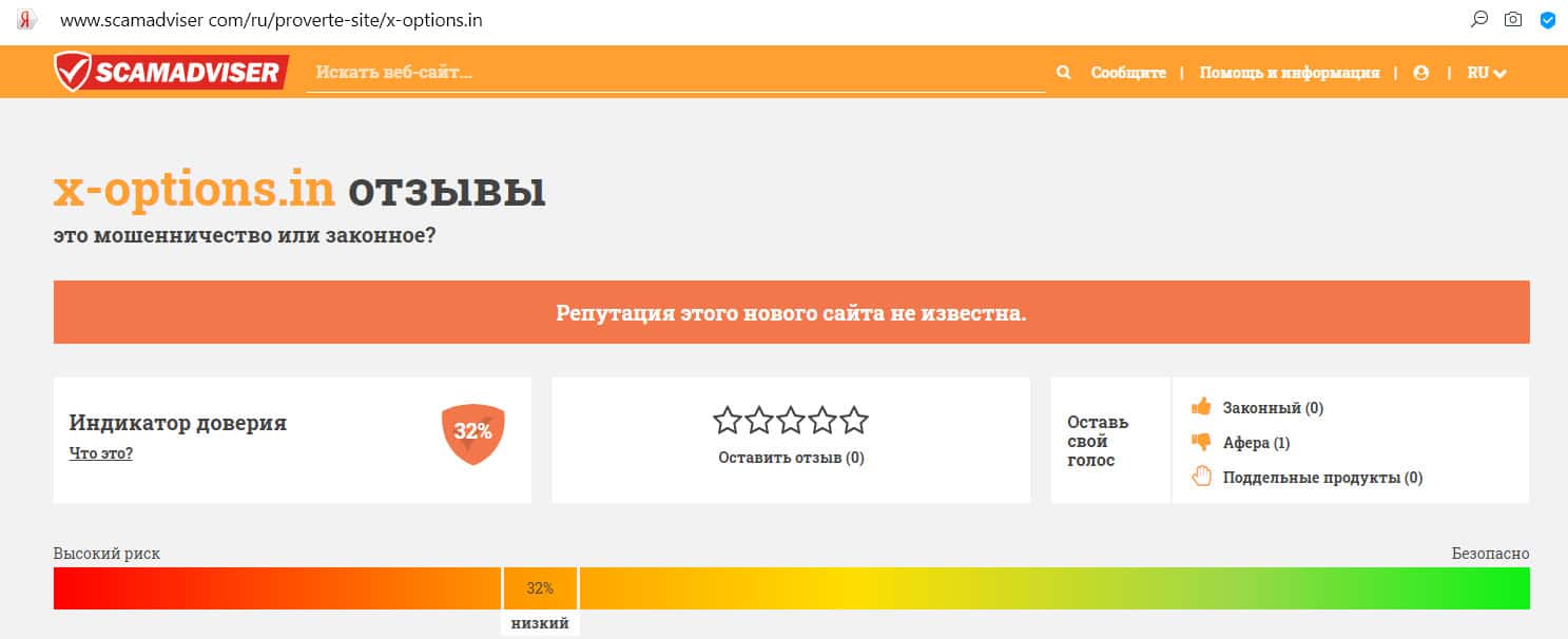 Сервис по проверки сайтов на мошенничество scamadviser com посчитал, что такому ресурсу, как x-options in, доверять нельзя и поставил ему низкую оценку.
