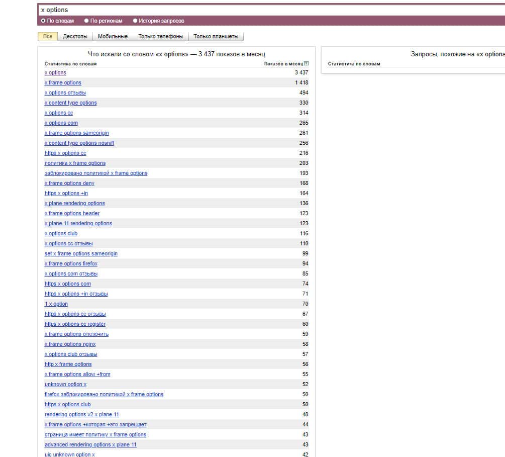 Количество запросов по доменному имени "x-options in", написанного с пробелом, по данным сервиса Яндекс Вордстат, равно тем же 3437 показам.
