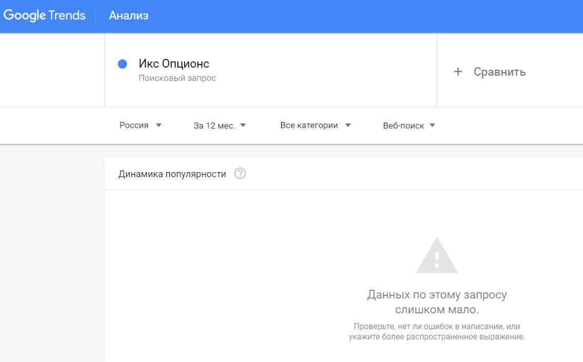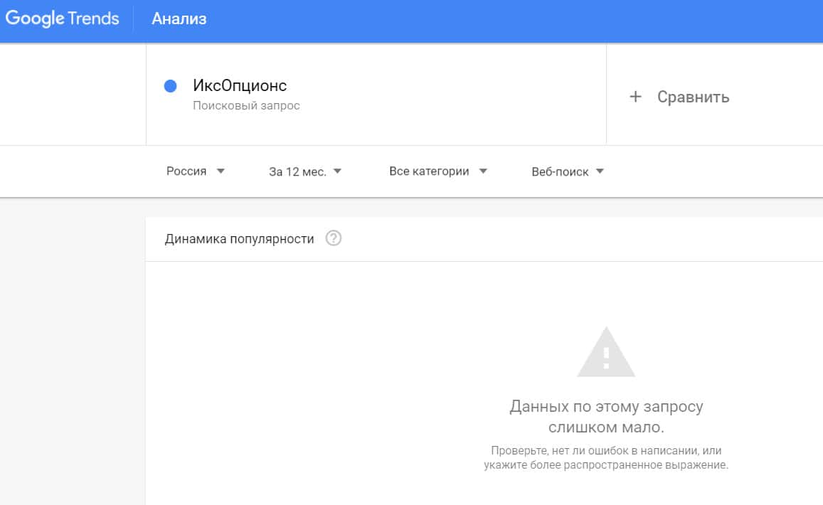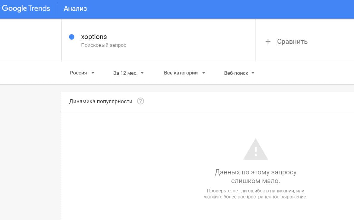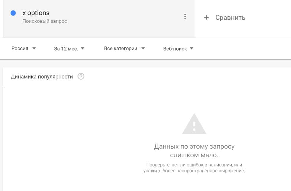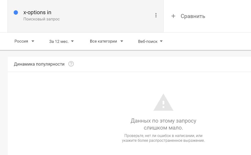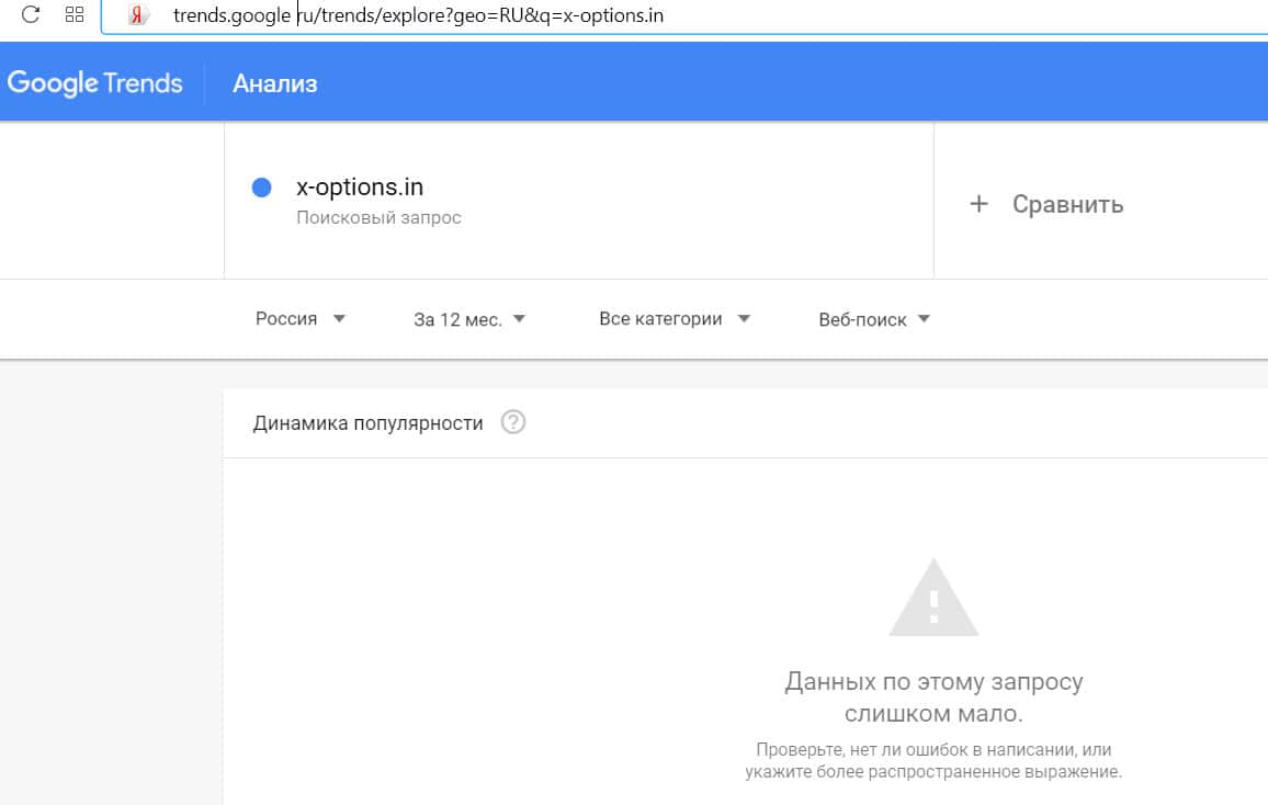 Количество запросов от пользователей по доменному имени "x-options in" в сервисе Гугл Тренд было очень небольшим.