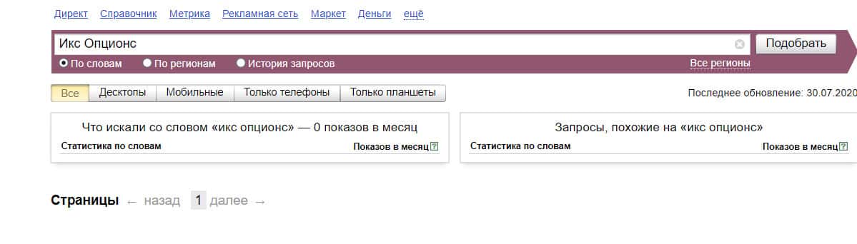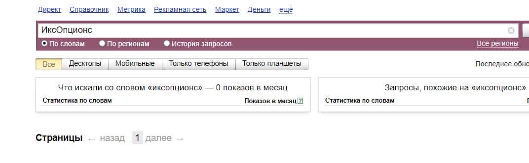 Название бренда "ИксОпционс" на русском языке люди не искали в системе Яндекс ни разу.
