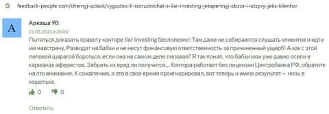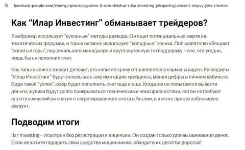 Связавшись с жуликами Ilar Investing вы рискуете потерять все вложенные средства до копейки, о чем предоставлен пользовательский отзыв на скрине ниже.