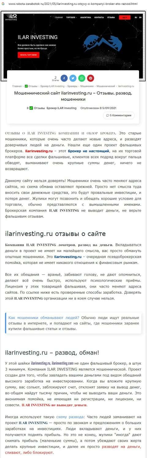 Ниже предоставлен коммент о том, что шулера Илар Инвестинг разводят людей на деньги и обманным путем заманивают на свой дырявый сайт.