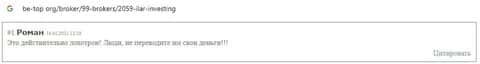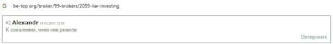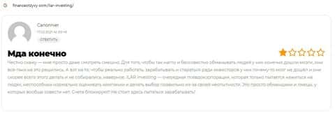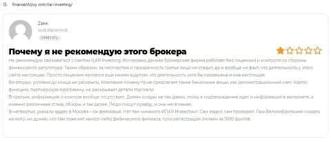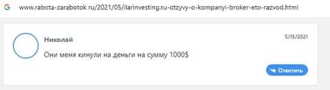 Лохотронщики Ilar Investing обманывают своих клиентов, подтверждением чего является данный пользовательский комментарий о скам-брокере.