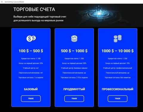 ОбманщикиИлар Инвестинг предлагают клиентам на выбор 3 типа торгового счета: Базовый, Продвинутый и Профессиональный. Реальный Форекс стартует в основном с суммы в 100 000 $.