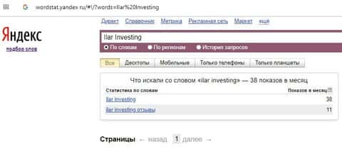 Количество запросов по бренду названия компании на русском языке "Илар Инвестинг" на wordstat yandex ru составляет 21 показ за месяц.
