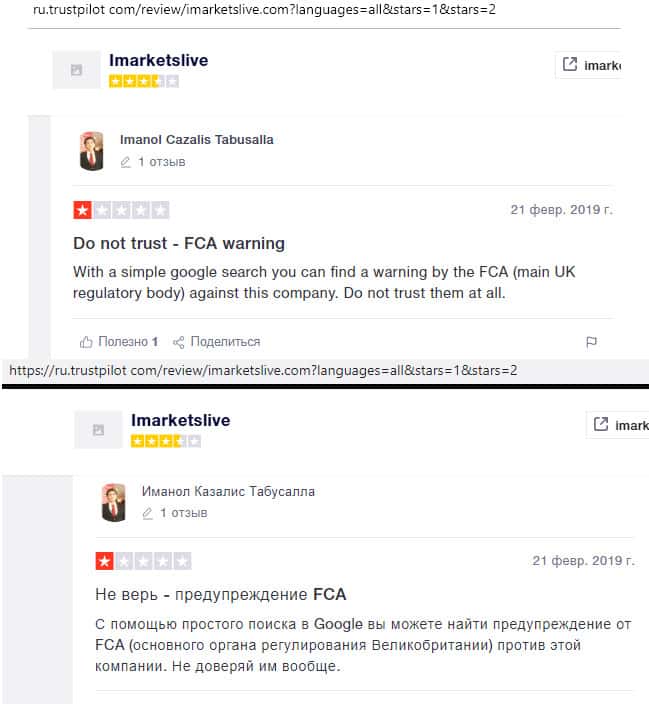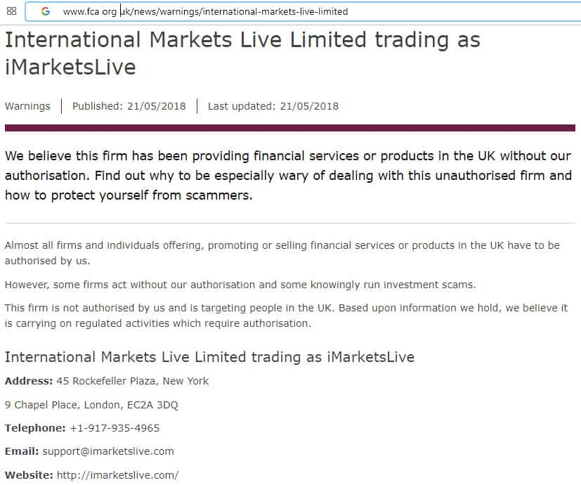 Также нам стало известно, что до сего времени, лохотрон Ай Маркетс Лив размещался также и в Лондоне и за счет этого находился под регуляцией FCA. Но к счастью данный регулятор проверил всю их деятельность более тщательно и теперь жулье iMarketsLive находится в черном списке.