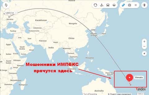Чтобы избежать ответственности и сэкономить на налогах, аферисты ИМПЕКС сделали оффшорную регистрацию! На сайте есть ссылка на карту с геометкой на Вануату. И все - больше никаких контактных данных мошенники ИМПЕКС не предоставили. Из разных разделов и документов удалось вытянуть: