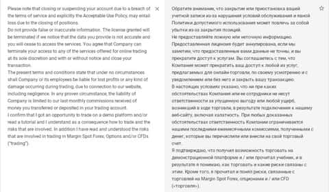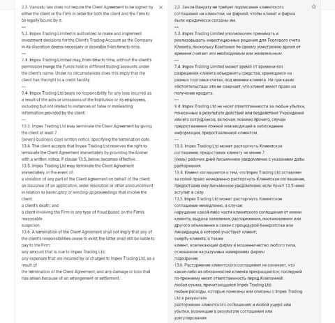 На сайте мошенников ИМПЕКС есть клиентское соглашение, приведенное на английском языке. Если его перевести, становится понятно, что жулики оставляют за собой право расторгать его в одностороннем порядке и не берут на себя ответственность за любые убытки, которые может понести "клиент".