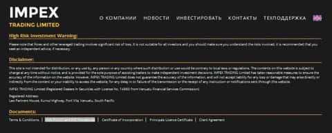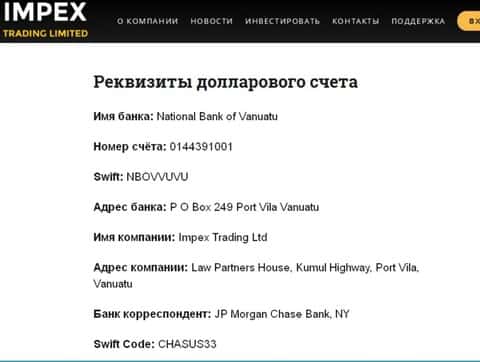 Аферисты ИМПЕКС зарегистрировали свою контору в оффшоре на маленьком острове Вануату по адресу Law Partners House, Kumul Highway, Port Vila. Опытные трейдеры знают, что сотрудничать с подобными брокерами небезопасно - сохранность ваших средств никак не защищена, и в случае их кражи претензии предъявлять некому.