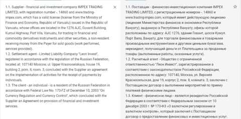Настораживает трейдеров и то, что аферисты ИМПЕКС не указывают на своем сайте, какие способы оплаты они принимают. Но если вчитаться в предоставленную текстовую документацию, там мелькает название зарегистрированного в РФ расчетного агента "Леон Инвест", через которого и проходят все денежные операции.