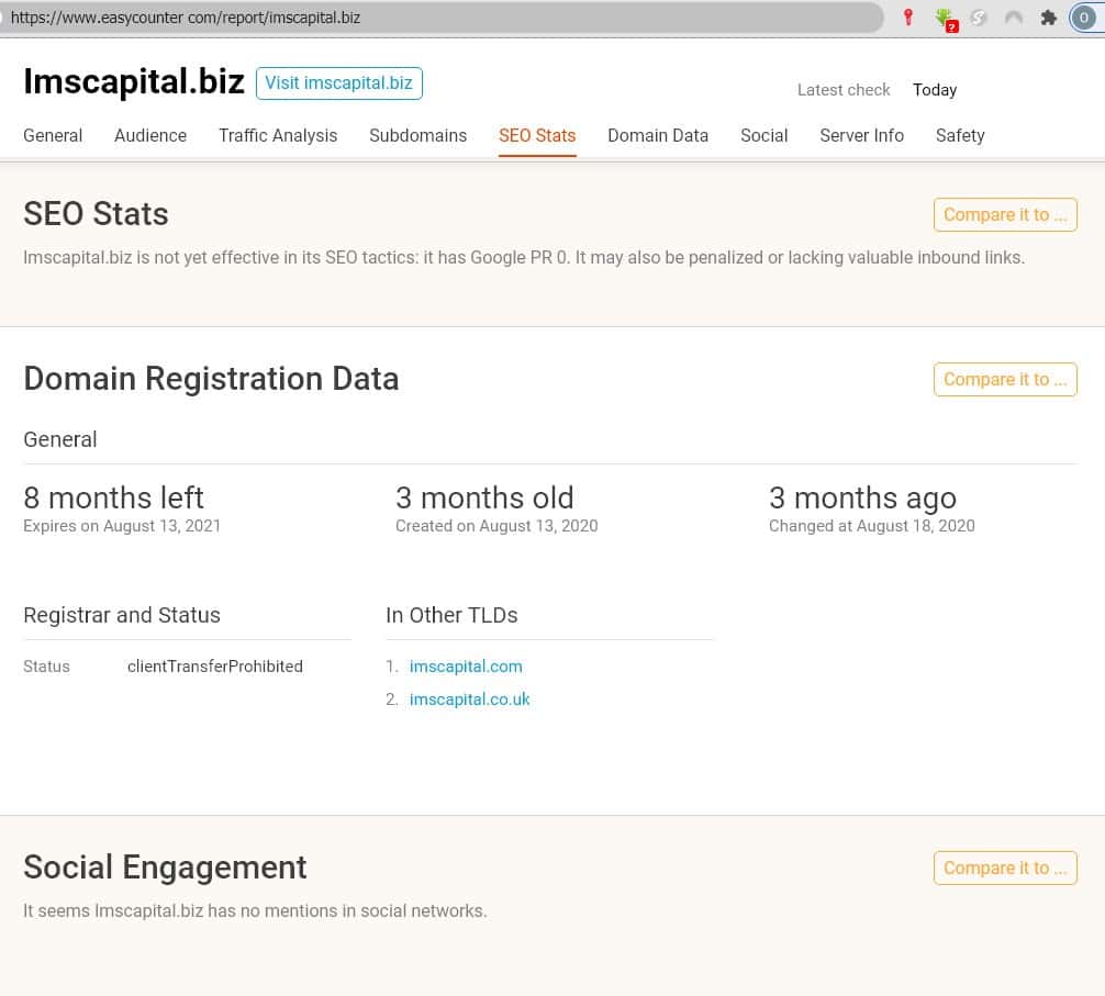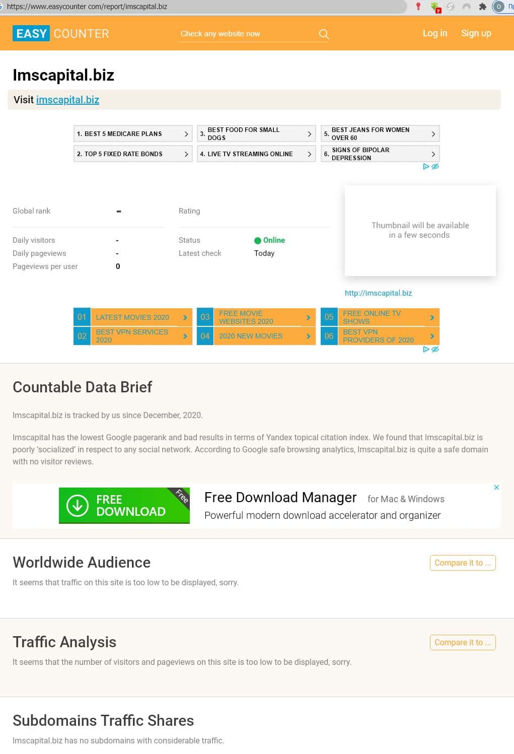 Немного более информации о портале жуликов ИМС Капитал удалось получить на портале easycounter. Трафик сайта мошенников оказался ничтожно мал, что оценке не подлежит.