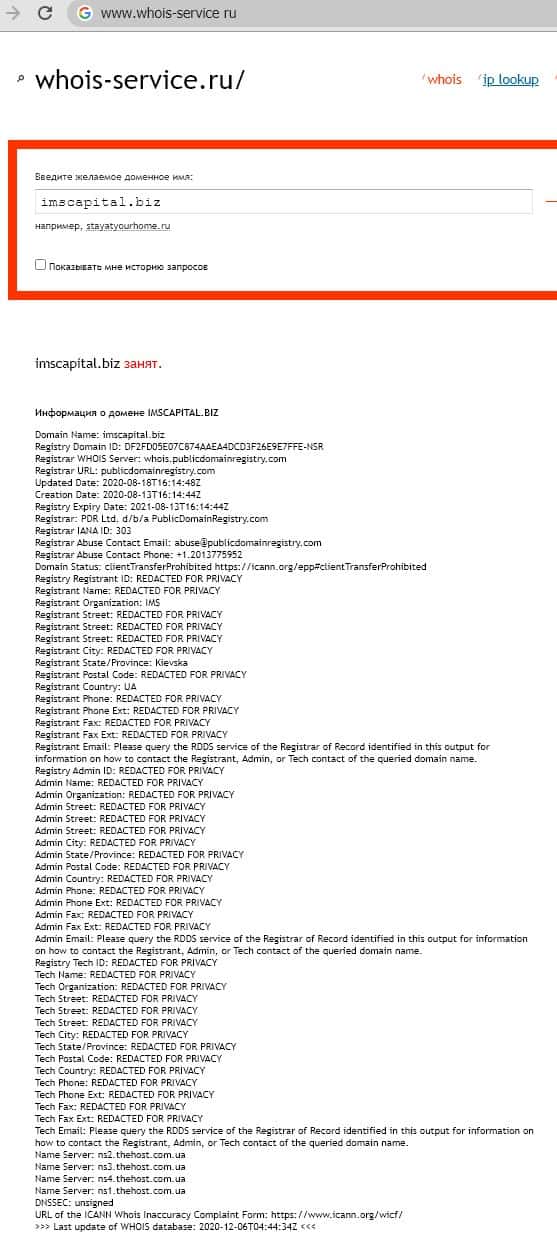 Сведения о владельцах домена imscapital biz