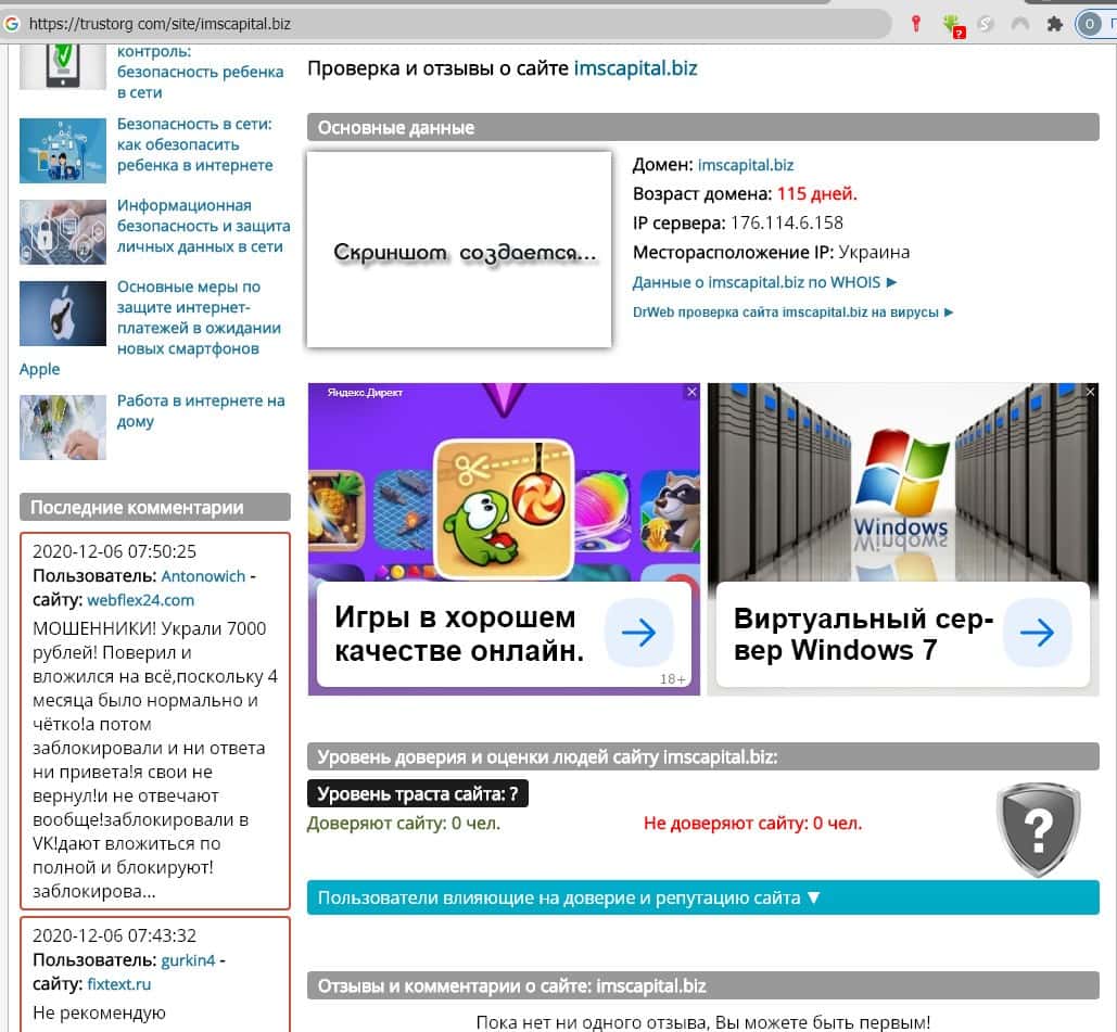 Не доверяет сайту ИМС Капитал и сервис "Доверие в сети". Сервер мошенников расположен в Украине, а комментариями и отзывами о ресурсе жуликов trustorg не располагает.