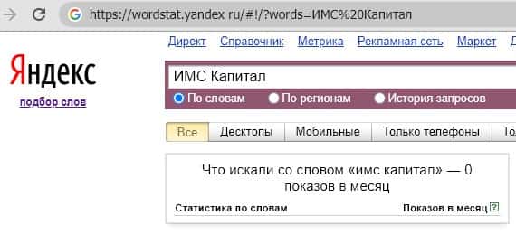 Анализ количества поисковых запросов бренда "ИМС Капитал" в поисковой системе Яндекса показывает полное игнорирование этой юридической организации пользователями.