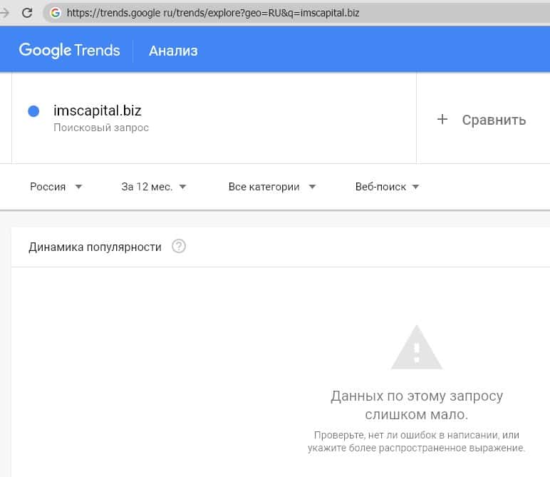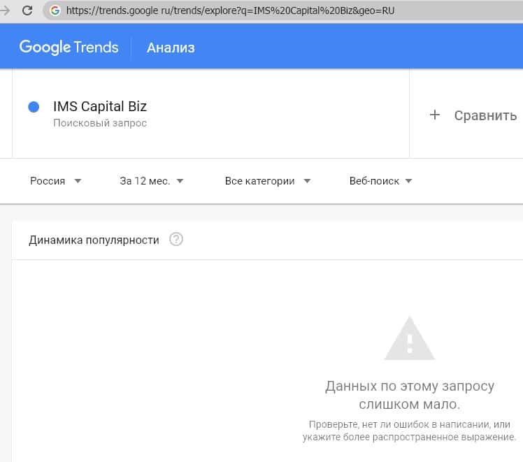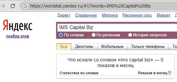 Анализ поисковых запросов латинского названия бренда характеризуется теми же нулевыми показателями. Пользователи слыхом не слыхивали о компании "IMS Capital biz".