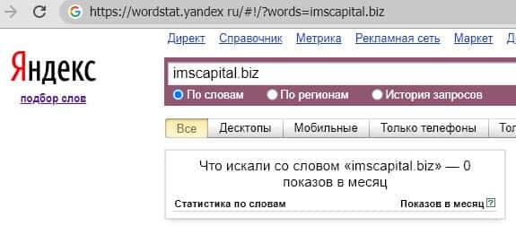 Анализ поиска сайта мошенников "imscapital.biz" в поисковой системе Яндекса аналогичен предыдущим ситуациям. Пользователям русскоязычного сегмента Сети он не интересен.
