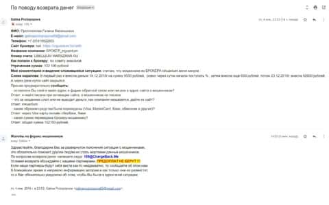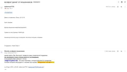 Письмо с жалобой пришло к нам на почту, где человек обвиняет дилинговую контору Ин Квантум в том, что они жулики и обманщики. Однажды ему позвонил звонарь из этой кухни и стлал вымогать 100 000 рублей для приумножения капитала клиента. Человек повелся на уговоры мошенников и перевел через банковскую карту всю оговоренную сумму. После перевода ни слуху, ни духу от сотрудников конторы, которые так яро до этого звонили. Теперь задача вернуть украденное и банковская выписка для наших партнеров по чарджбеку уже почти готова.