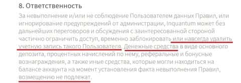 Далее рекомендую увидеть главное правило интернет-лохотрона Ин Квантум, согласно которому, эти жулики вправе кинуть любого из своих клиентов, удалив его аккаунт и присвоив себе его денежные средства в полном объеме.