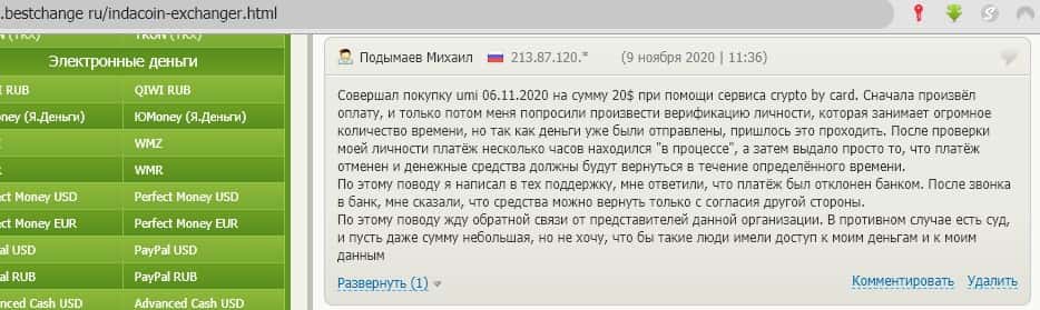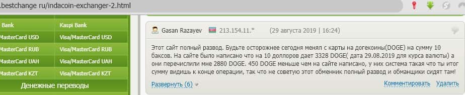 На другом портале bestchange ru так же достаточно много отзывов, содержащих примеры мошенничества на криптообменнике Инда Коин, у этого клиента, к примеру потянули 20 баксов.