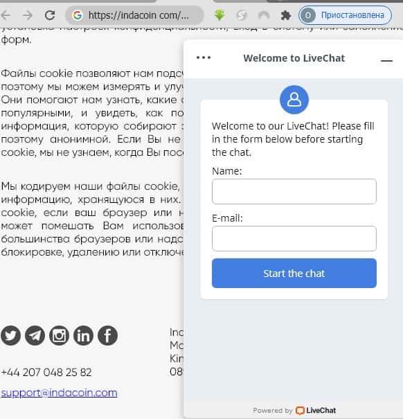 Портал криптообменника IndaCoin располагает и сервисом онлайн-чата, который, к сожалению, предназначен всего лишь для сбора контактов заинтересовавшихся пользователей.