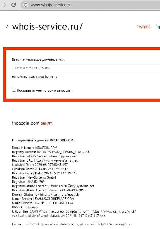 Проверка на принадлежность домена Инда Коин результатов не дала. И это, как раз, вполне ожидаемо. Было бы, наоборот, странно, если бы мошенники прямо привели нас к себе.