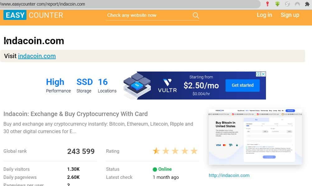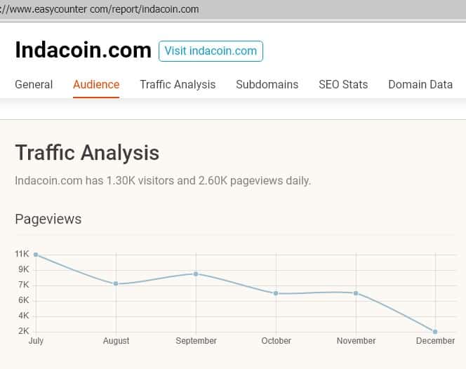 Портал easycounter показывает тоже посредственную популярность криптообменника Инда Коин. Подавляющее большинство пользователей ограничиваются знакомством и покидают сайт.
