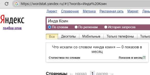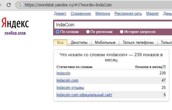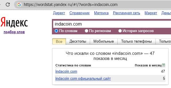 Анализ брендовых запросов о криптовалютном обменнике Инда Коин на поисковом сервере Яндекс