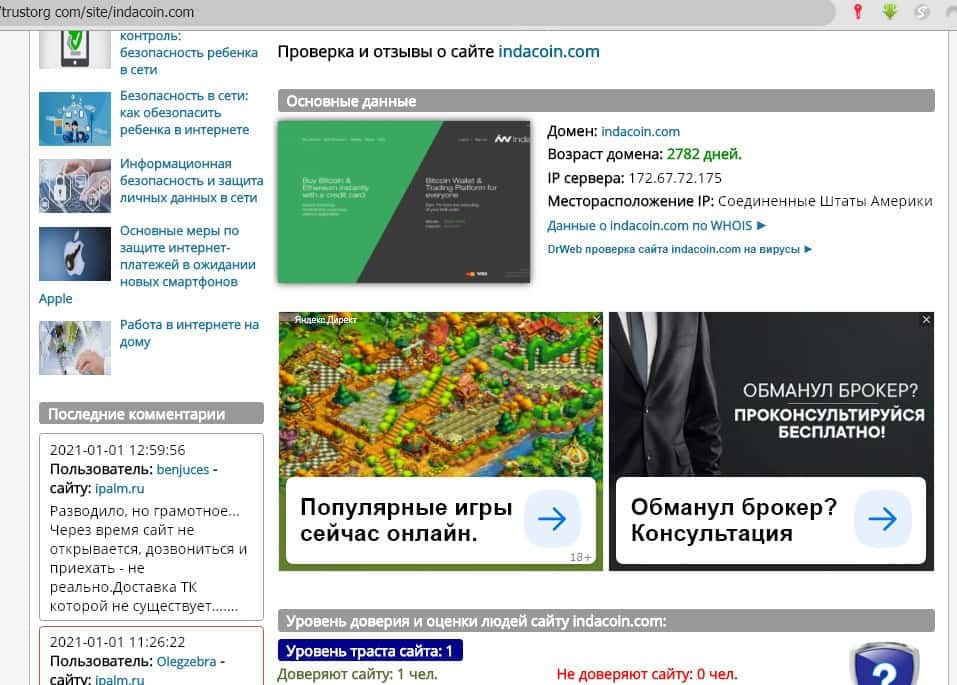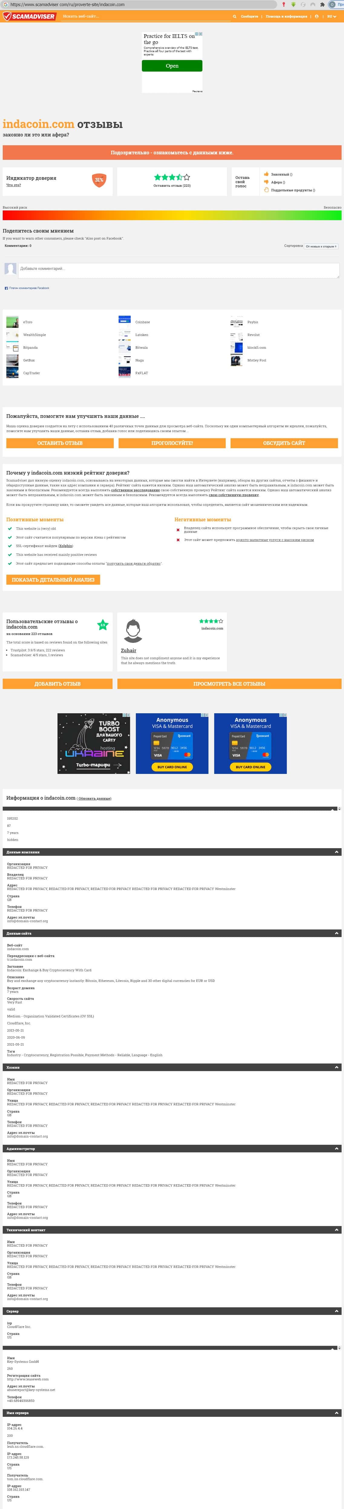 - Рекомендация портала scamadviser com не доверять сайту криптовалютного лохотрона IndaCoin
