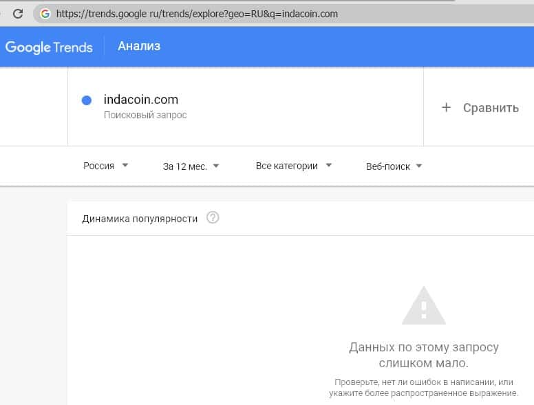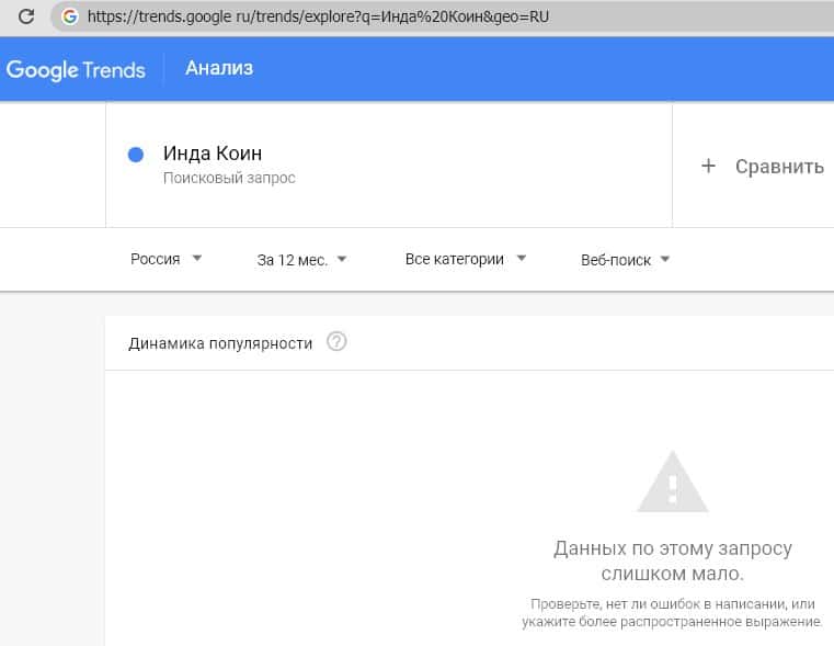 В американской поисковой системе Google дела с поисковыми запросами бренда "Инда Коин" обстоят таким же образом: их показатель где-то в районе нулевой отметки.