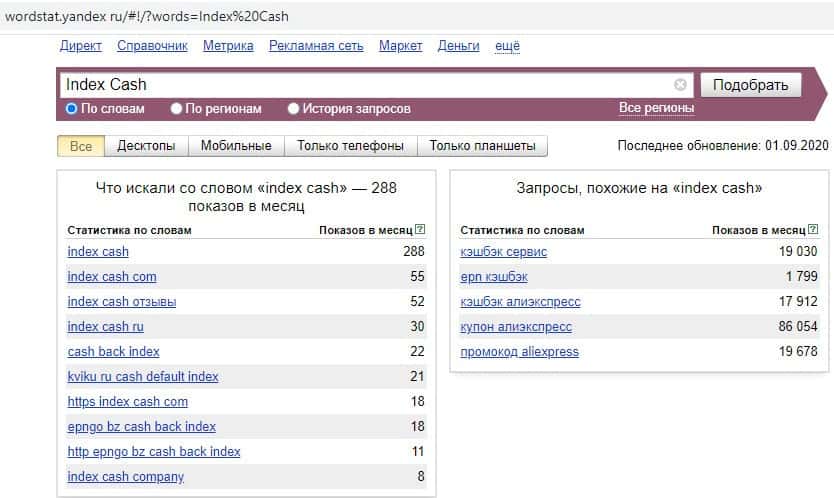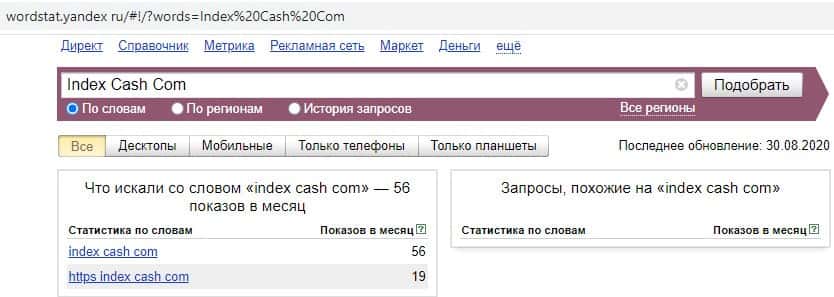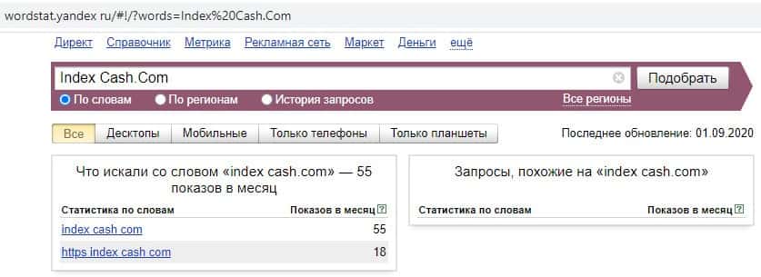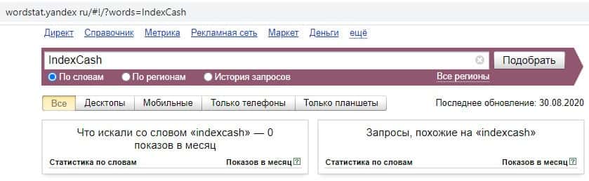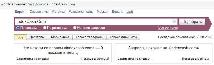Такой же запрос на английском языке только без пробелов и с точкой "IndexCash.Com" выдает результат в 0 показов в месяц.
