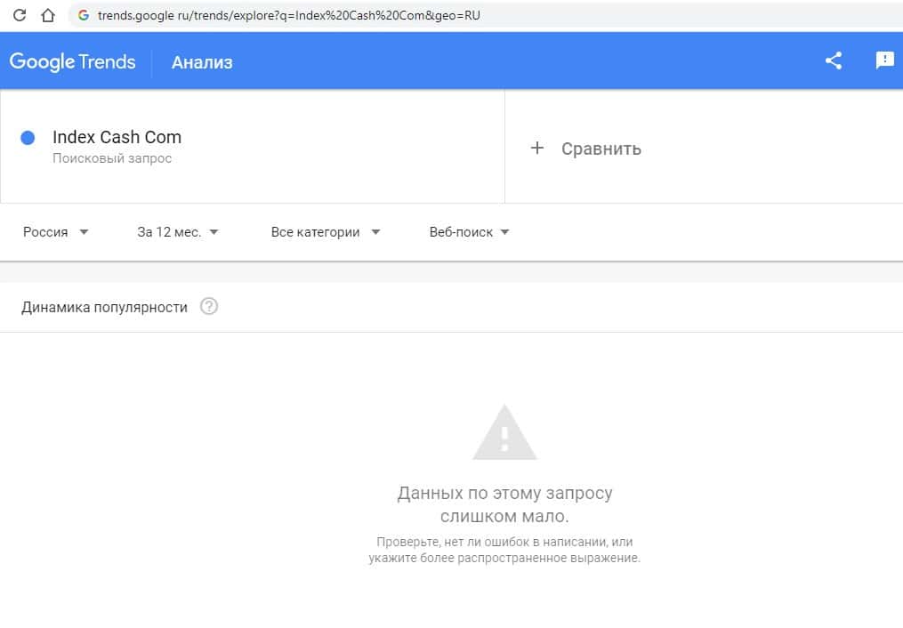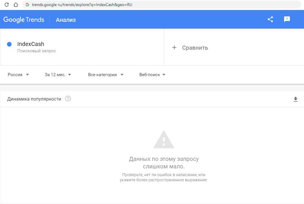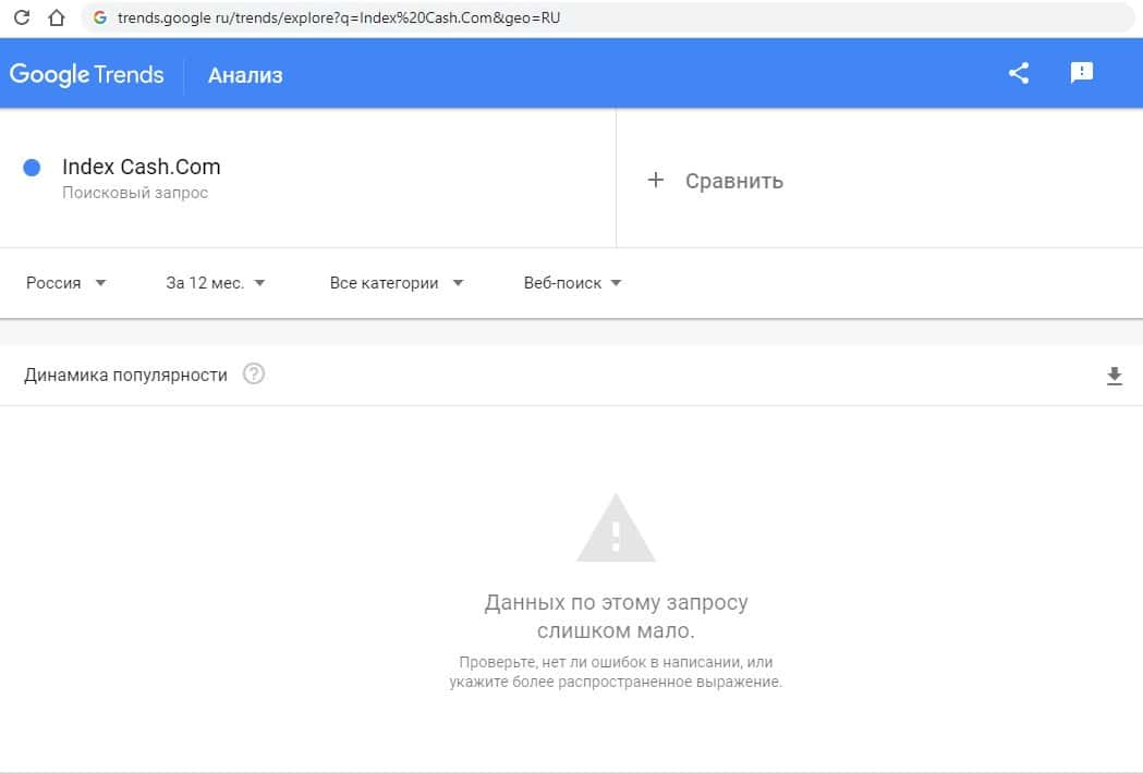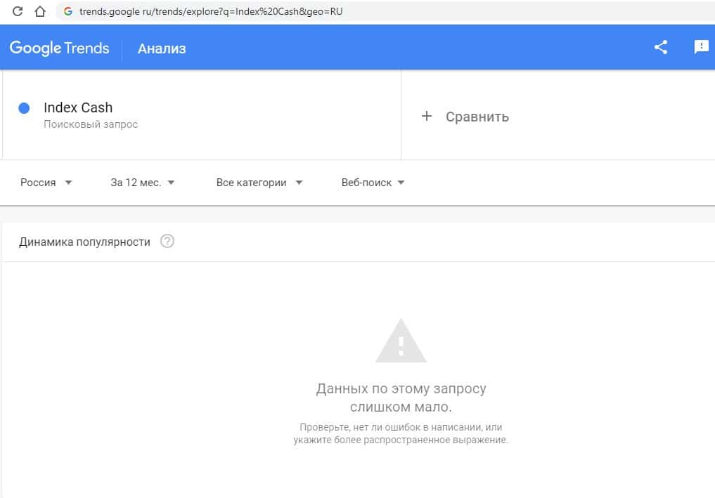 Начнем с запросов на английском языке. Первый запрос на английском языке в гугл "Index Cash" выдает 0 показов в месяц. Так информацию об аферистах никто не ищет.