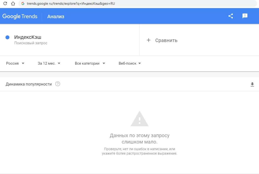 И последний запрос в гугл на русском языке без пробела "ИндексКэш" выдает результат тоже в 0 показов в месяц.