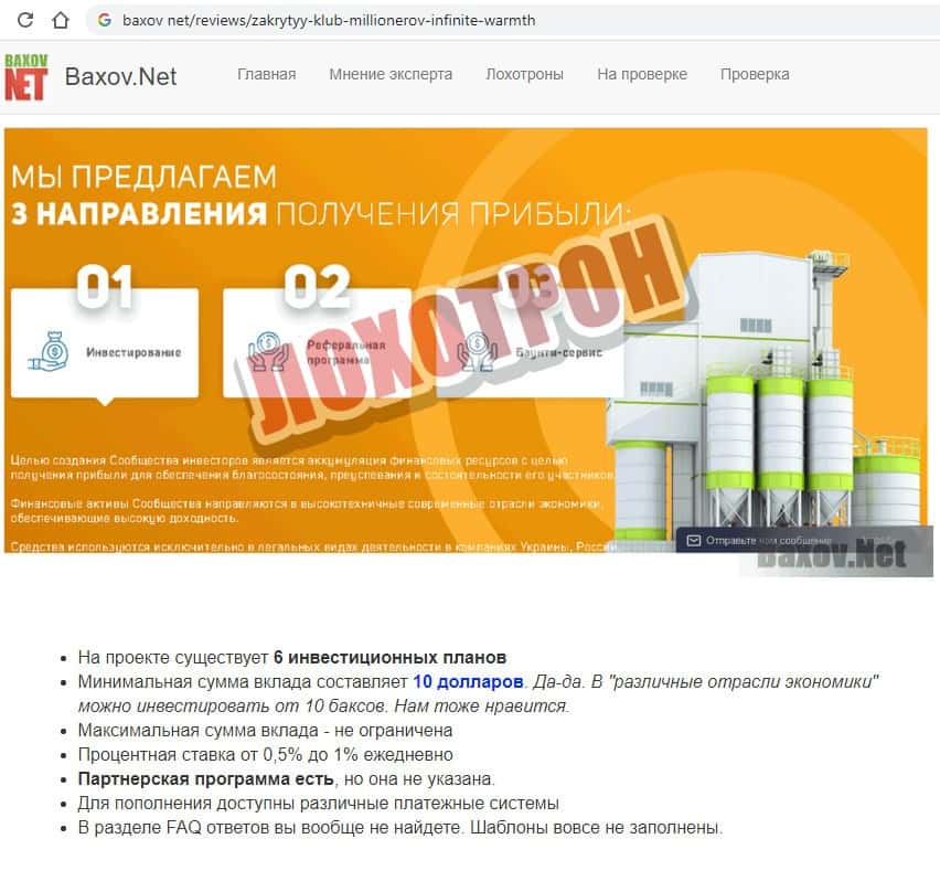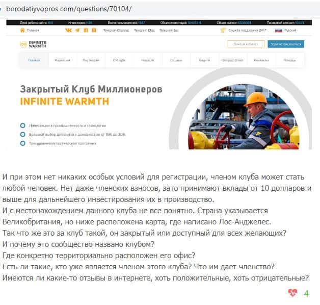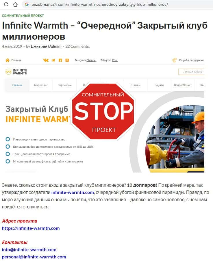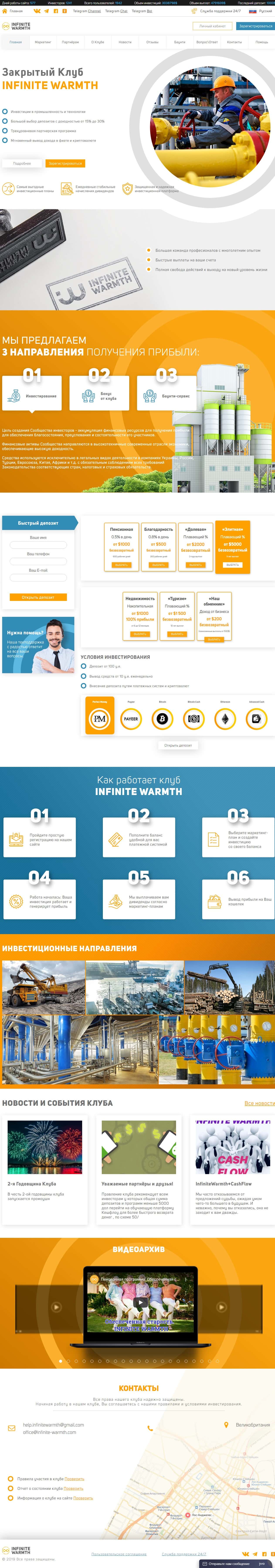 Infinite Warmth - закрытый инвестиционный клуб мошенников, который предлагает своим клиентам разные типы дохода. На самом деле, этот проект является ничем иным, как обычной финансовой пирамидой, с которой просто нельзя иметь никаких общих дел. Сегодня уже есть десятки пострадавших от их жульнических действий. С этими аферистами лучше не связываться!