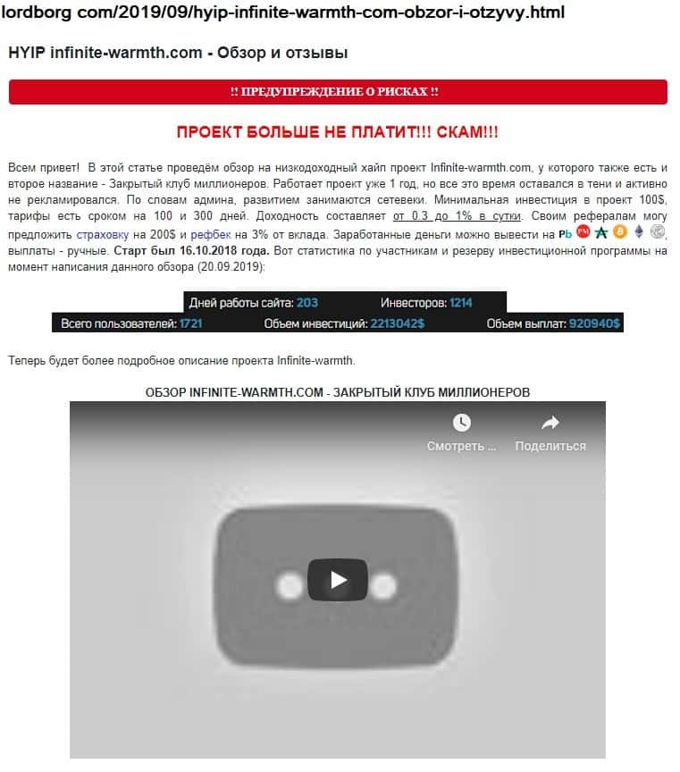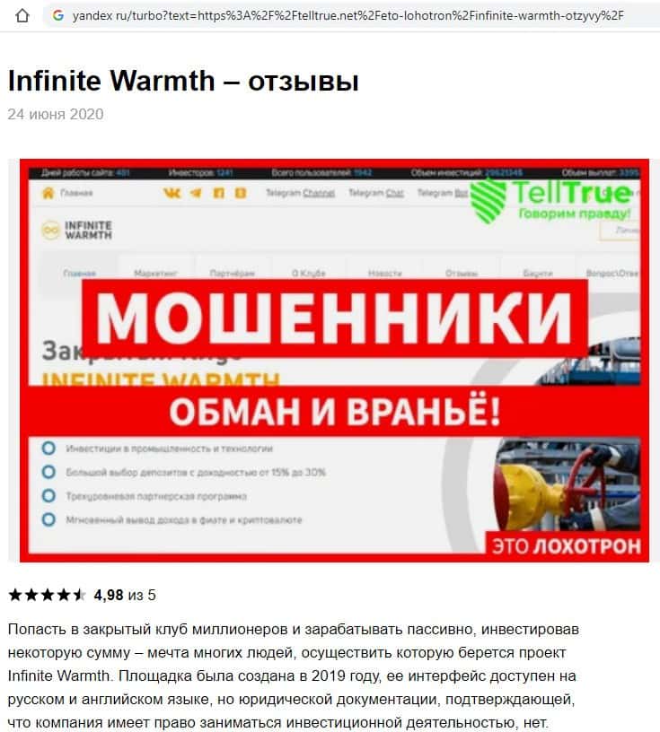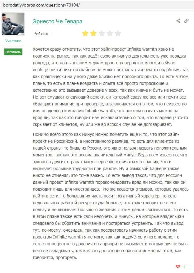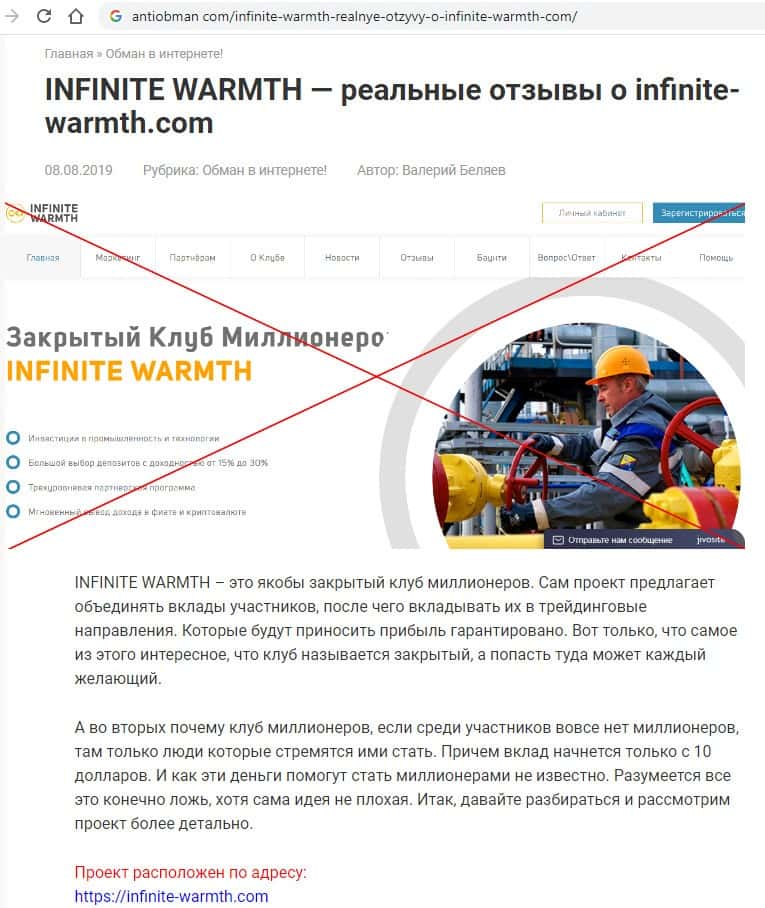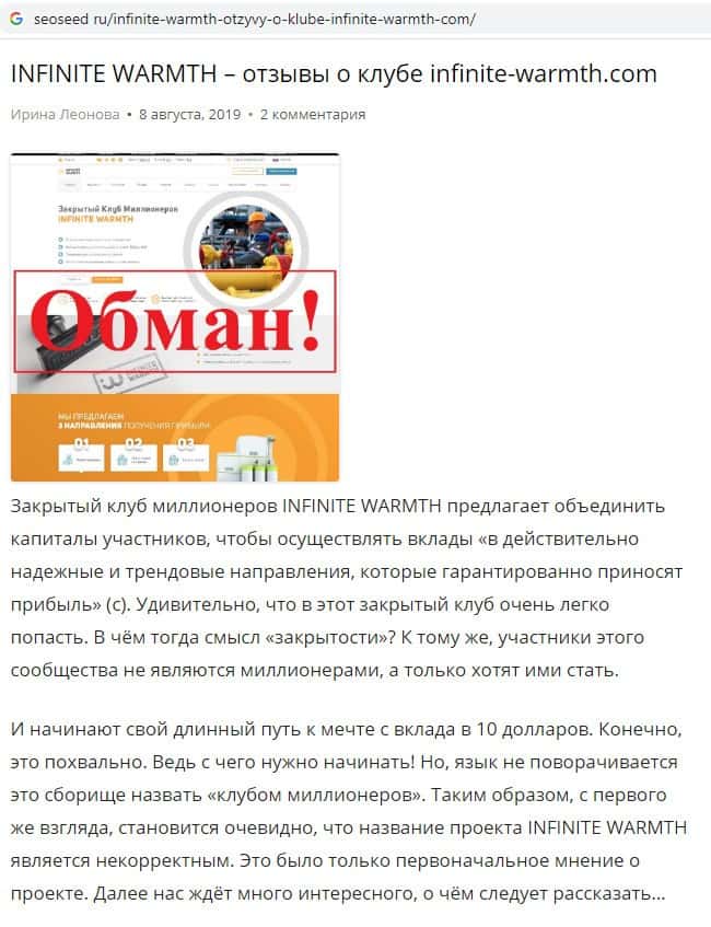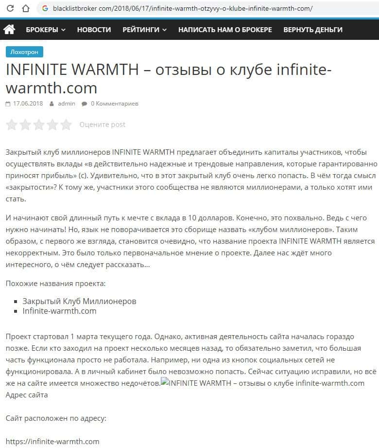 Первый же авторитетный источник в сети говорит о том, что с аферистами Infinite Warmth не стоит связываться и иметь каких либо общих дел, потому что это лохотрон.