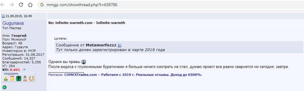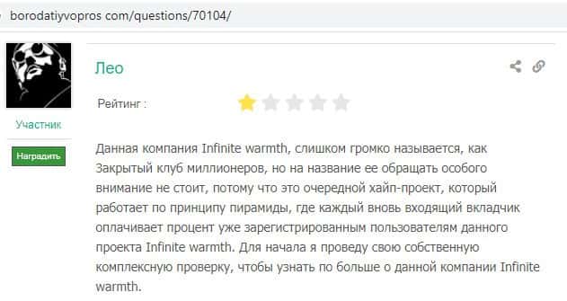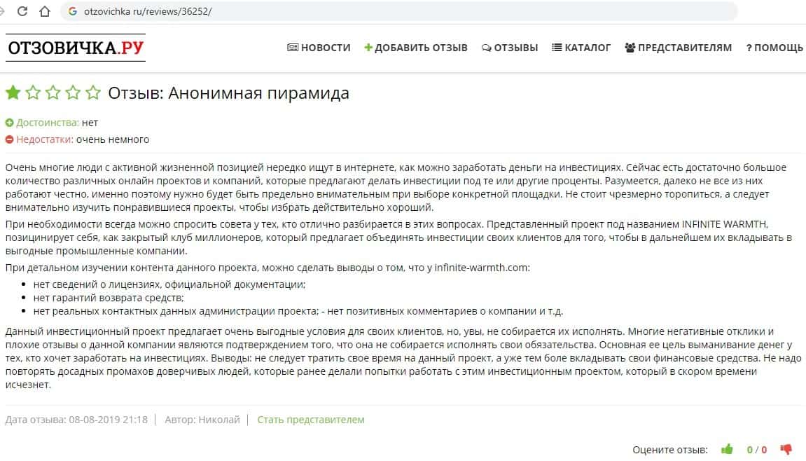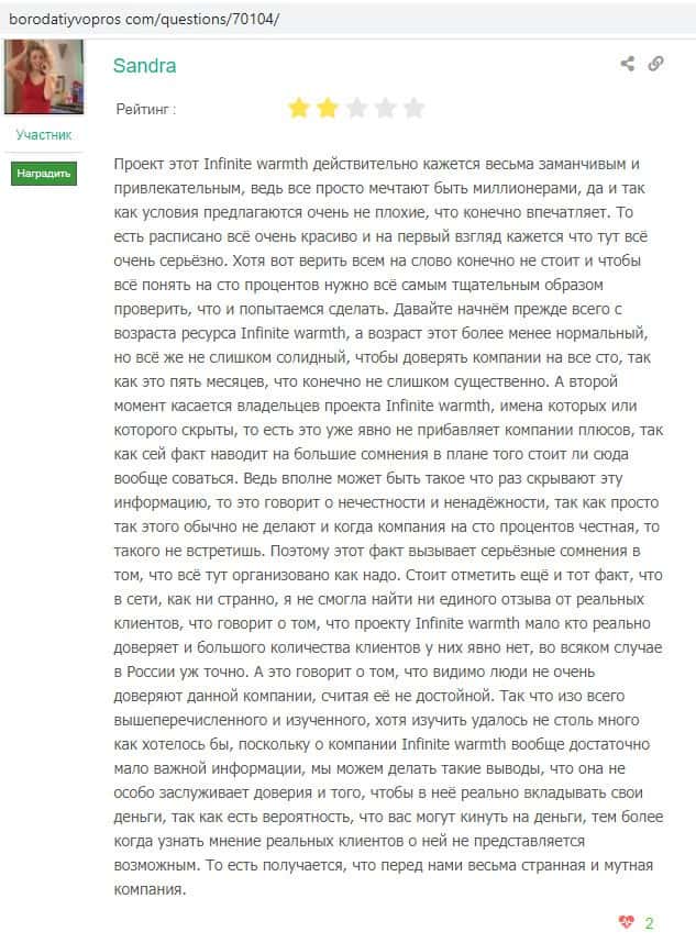 - Мнение о мошенниках Infinite Warmth не разных сайтах